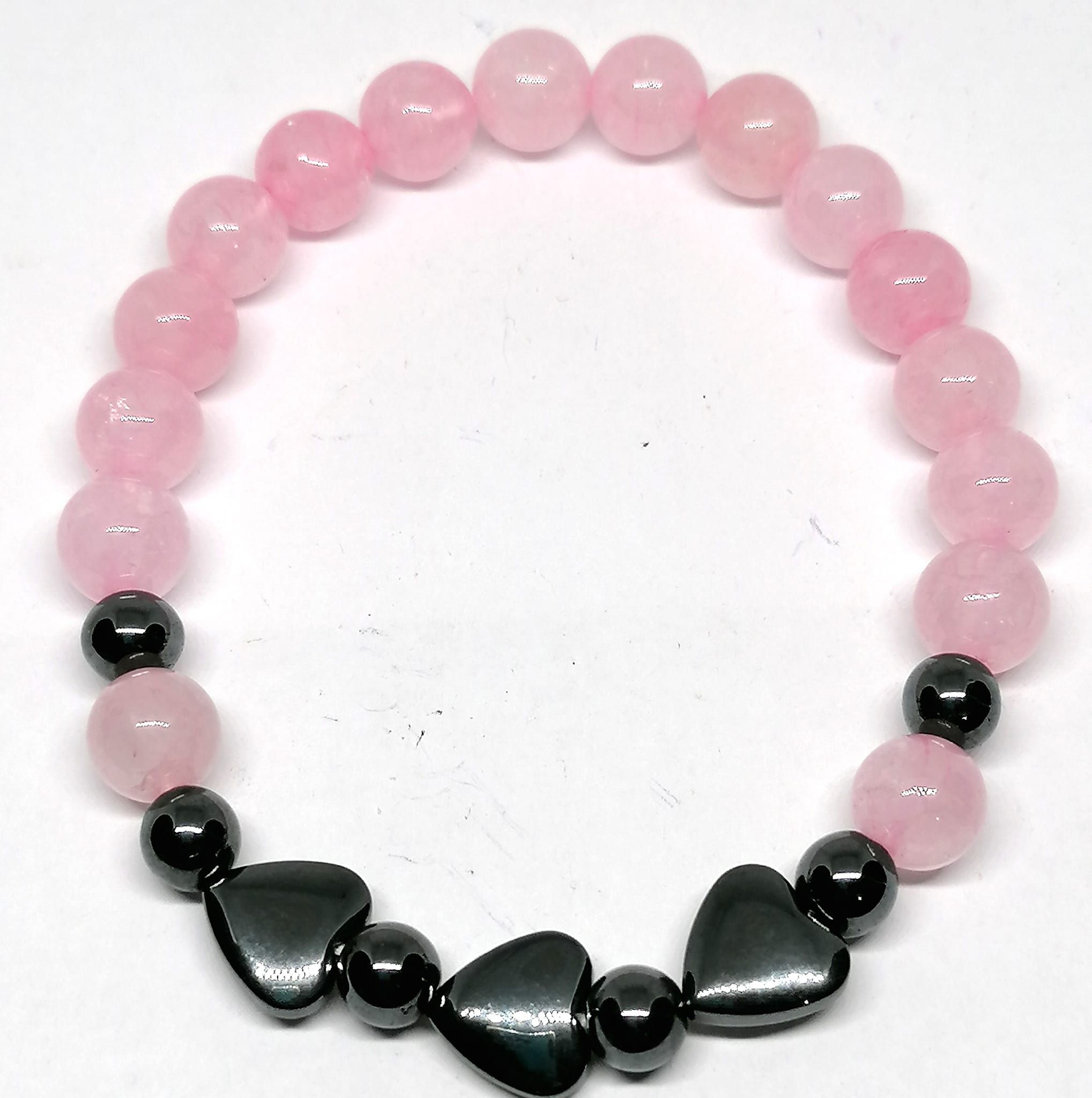 Růženínový náramek doplněný srdíčky a kuličkami z hematitu. Moc pěkná kombinace.