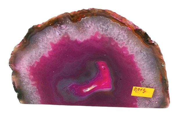 Tento kus je barevně zvýrazněn do růžového tónu, což podtrhuje strukturu a přirozené linie kamene. Dobravování je u achátů běžnou úpravou, která zvýrazňuje estetický efekt při zachování přírodní struktury minerálu.
