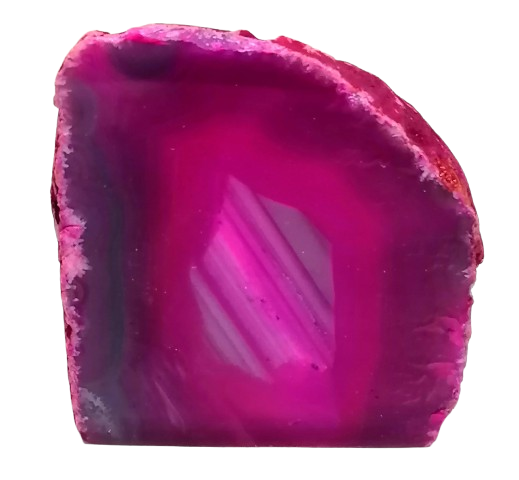 Dekorativní růžová achátová půlka s výrazným páskováním a přirozenou kresbou minerálu. Achát je dobarvovaný pro zvýraznění barvy a struktury. Spodní část tvoří řezaná základna, díky které kámen stabilně stojí a je vhodný k vystavení.