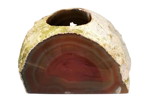 Hnědý achátový svícen na čajovou svíčku, vytvořený z achátové pecky pocházející z Brazílie. Tento konkrétní kus o rozměrech 9 × 10 × 6 cm zaujme strukturou kamene. Do svícnu se hodí klasická čajová svíčka, jejíž světlo nádherně prosvítí kresbu achátu a vnese do interiéru teplou a harmonickou atmosféru.