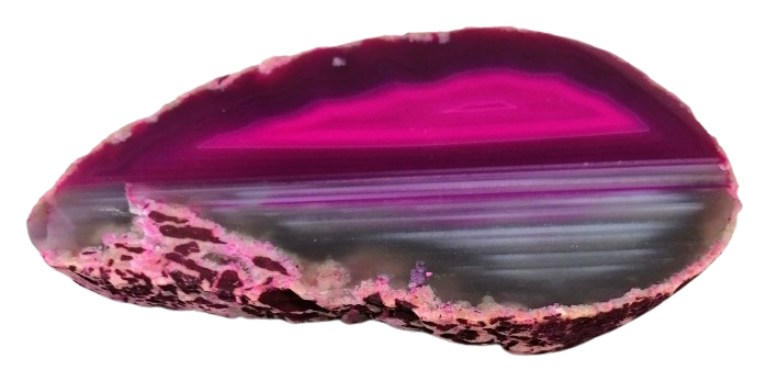 Tento dekorativní plátek vyniká výraznou kresbou páskování a sytou růžovou barvou. Je vhodný jako designový doplněk do interiéru, meditační kámen nebo originální dárek.