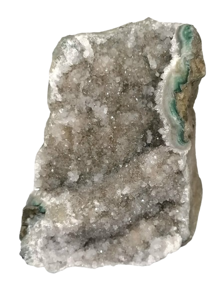 Objevte krásnou ametystovou geodku z Brazílie o váze 603 g, která zaujme nejen fialovými krystaly ametystu, ale také výraznou linkou zeleného achátu. Zelený achát se nachází i na spodní části geodky a celý kus je navíc místy pokryt drobnými krystalky křemene, které dodávají geodě jedinečný třpyt.