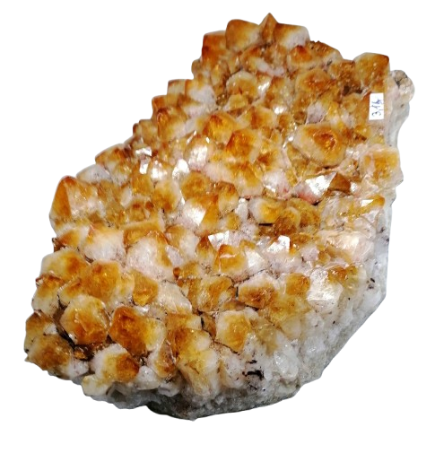 Impozantní citrínová drůza s nádherně vyvinutými velkými špicemi je výrazným přírodním solitérem, který okamžitě přitáhne pozornost. Díky své hmotnosti 3,1 kg a rozměrům 23 × 17 × 7 cm se stane dominantou každého interiéru – ať už doma, v kanceláři nebo v terapeutickém prostoru.