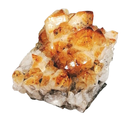 Citrín je zlatavá odrůda křemene (SiO₂), jehož barvu způsobují stopy železa. V tomto výjimečném kuse se v krystalových hrotech nachází přirozené inkluze minerálu Hematit (Fe₂O₃).