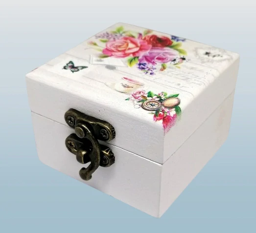 Stylová dřevěná dekorativní krabička s jemným motivem růží a praktickým zrcátkem uvnitř je ideální pro uložení šperků, drobností nebo talismanů. Díky kompaktním rozměrům 6,5 × 6,5 × 4,5 cm se skvěle hodí na noční stolek, do kabelky i jako milý dárek.