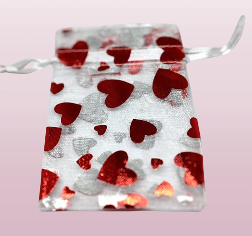 Díky jemnému designu v kombinaci bílé, průhledné a červených srdíček je pytlíček perfektní volbou také jako valentýnský dárkový obal.