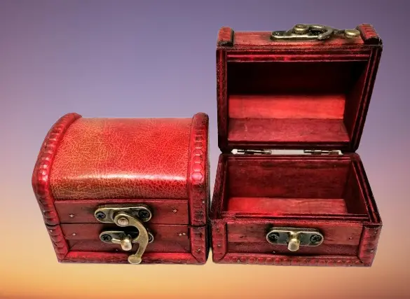 - Dřevěná mini truhlička s efektem kůže a mosazným úchytem (7,5 × 5,5 × 6 cm)