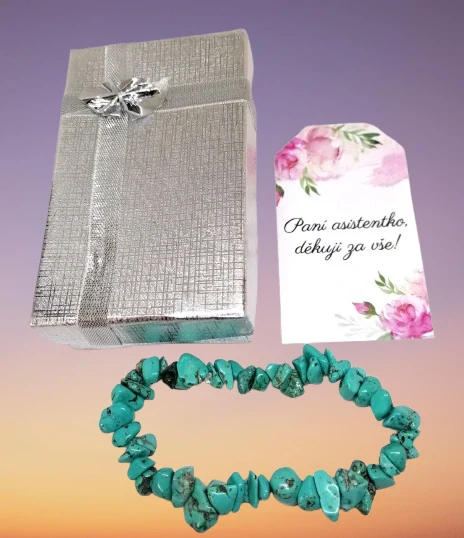 Originální a milý dárek pro paní asistentku, která si zaslouží ocenění za svou trpělivost, péči a každodenní pomoc. Součástí balení je tyrkenitový náramek a kartička s poděkováním a věnováním – vše připravené rovnou k předání.