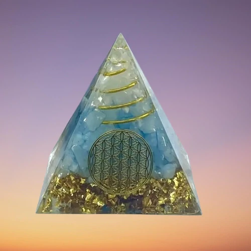 🔷 Orgonitová pyramida z akvamarínu a spirály života naplněné křišťálem – harmonizace prostoru i energie