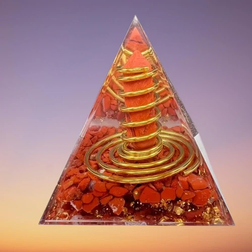 - Orgonitová pyramida s jaspisem, spirálou života a krystalem z jaspisu