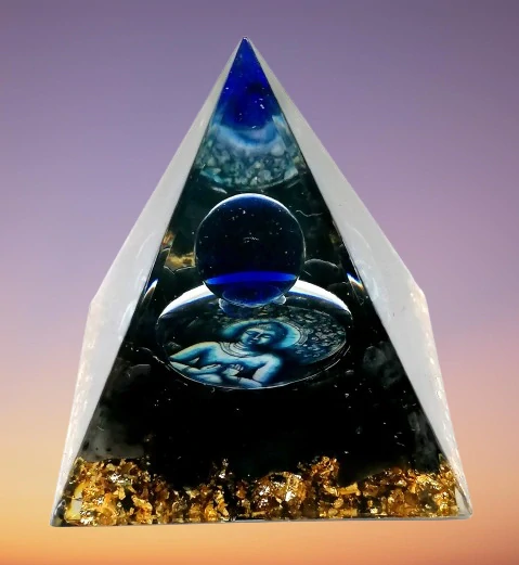 Orgonitová pyramida s obsidiánem. Doplněná je i o symbol Buddhy.