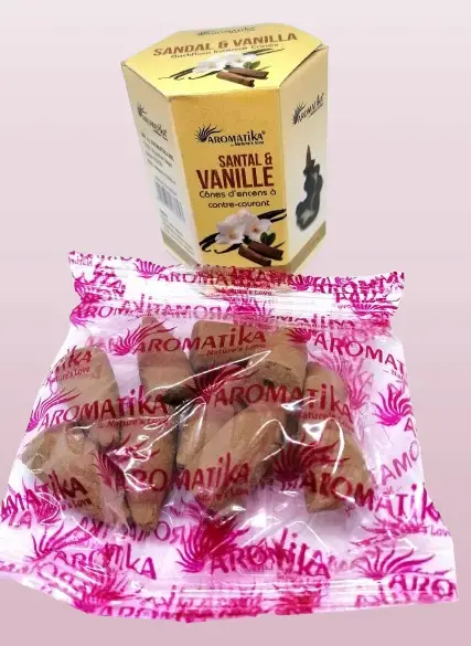 Vonné kužely AROMATIKA INDIA jsou určeny k provonění prostoru, pro chvíle meditace a jógová cvičení, relaxaci. Tato jedinečná kombinace nabízí sladké a dřevité aroma, které uklidňuje smysly. Santalové dřevo je často spojováno s relaxací a duchovním probuzením, zatímco vanilka dodává nádech sladkosti. Společně vytvářejí nádhernou a uklidňující vůni, která je ideální pro uvolnění po dlouhém dni.