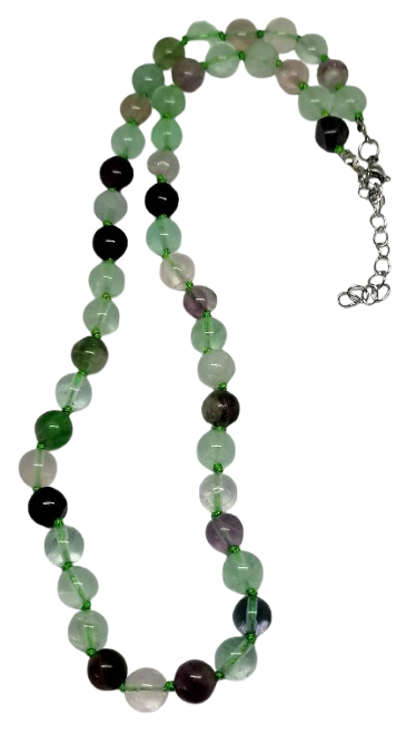 Každá kulička je pečlivě prouzlíkovaná, takže při případném přetržení nehrozí rozsypání celého šperku, ale pouze několika málo korálků. Fluorit je známý svou barevnou pestrostí – od jemné zelené až po sytou fialovou – a proto je každý náhrdelník naprosto jedinečný.