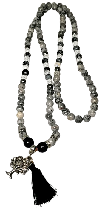 Elegantní Japa Mala z písmenkového jaspisu je tradiční indický růženec o 108 korálcích, který slouží k počítání manter při meditaci a duchovních praktikách. Celkový obvod mala je cca 73 cm, což umožňuje pohodlné nošení na ruce, zápěstí nebo kolem krku.