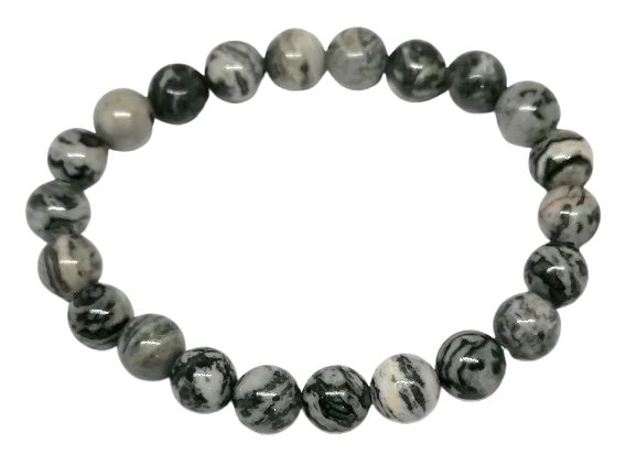 Stylový náramek z písmenkového jaspisu je tvořen přírodními kuličkami o průměru 8 mm, které vynikají svou originální kresbou připomínající písmenka. Tento jedinečný minerál je ceněn pro své uzemňující a ochranné vlastnosti.