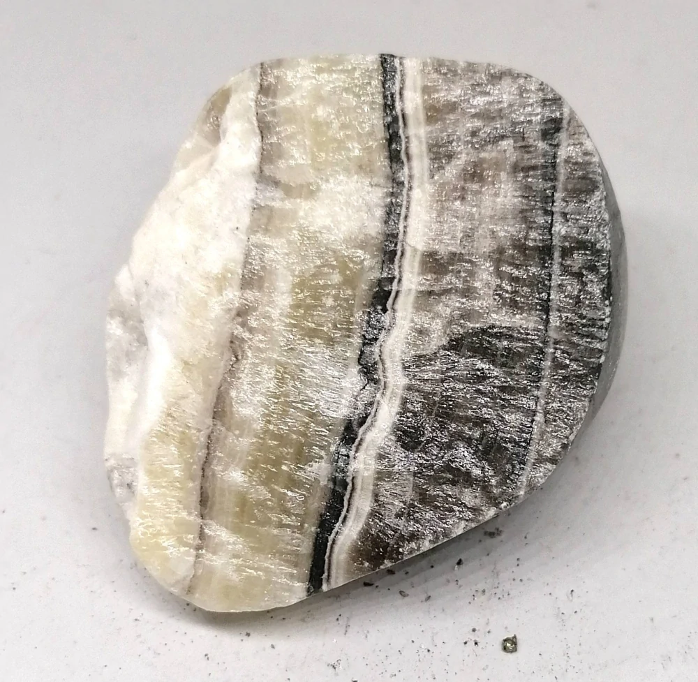 Tento pruhovaný kalcit pochází z Mexika a část jeho povrchu je vyleštěná, čímž zvýrazňuje přírodní kresbu a barevné pruhy. Zřejmě se jedná o část původně velkého jumbo kusu, která zachovává krásu a energii minerálu. Kupujete přesně tento kus.