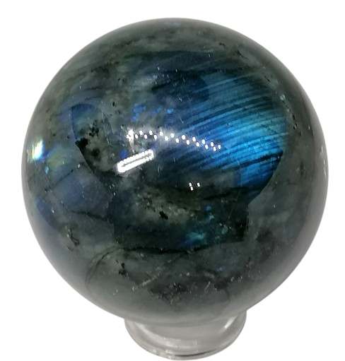 Luxusní labradoritová koule ve špičkové kvalitě AA. Tento výjimečný minerál pochází z Madagaskaru a vyniká svou typickou irizující hrou barev – hluboce modrou. Labradorit je známý jako kámen proměny, podpory intuice a vnitřního klidu. Pomáhá zklidnit mysl, posílit představivost a podpořit osobní růst. Má pozitivní vliv na nervový systém, hormonální rovnováhu i metabolismus. Ideální jako talisman při změnách, pro meditaci nebo jako krásný sběratelský kus.