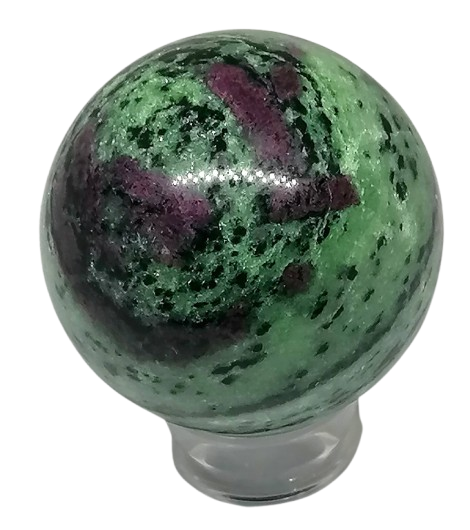 Rubín v zoisitu ve formě dokonale leštěné koule je fascinující přírodní kombinace, která okamžitě upoutá pozornost svou kontrastní barevností. Sytě zelený zoisit doplňují výrazné rubínové struktury, díky čemuž působí tento kámen luxusně, živě a velmi dekorativně.