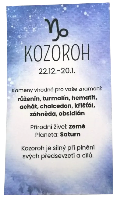 Horoskopová kartička Kozoroh – originální dárek s charakteristikou znamení zvěrokruhuihned 13 ks10 Kč/ ks8 Kč bez DPH