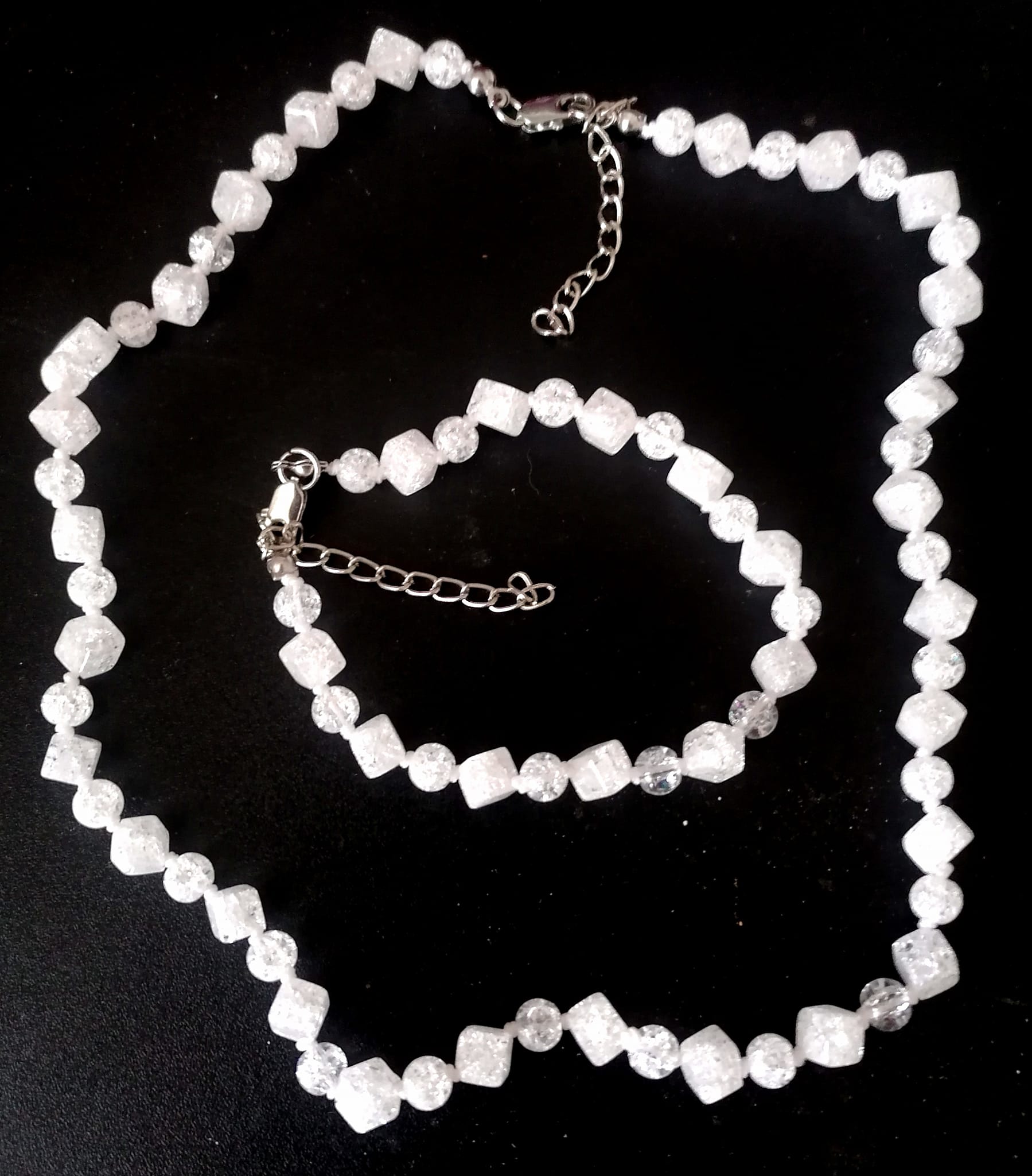 Navlečen na bavlněné šnůře a za každým korálkem je uzlík, který zabrání při event. roztržení vysypání všech korálků. Takto se uvolní maximálně dva korálky. K náhrdelníku je ještě náramek na zapínání také z oceli, takže může být jeho obvod od 18,5 - 24 cm. Díky prodlužovacímu řetízku.