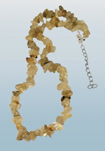 Křišťál s rutilem, náhrdelník ze sekaných kousků minerálu.