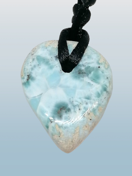 Přívěsek z larimaru ve tvaru kapky s vyvrtaným otvorem. Včetně šnůrky na krk. Druhá strana kapky je úplně jako písečná pláž přecházející v moře.