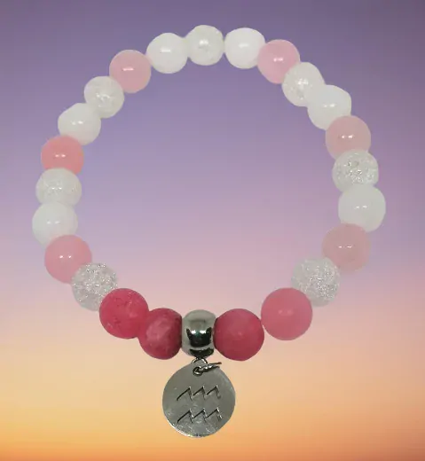 Náramek je z pukaného křištálu, jadeitu a růženínu. Náramek je doplněn přívěskem se znamením z chirurgické oceli přesně k tomuto znameni.