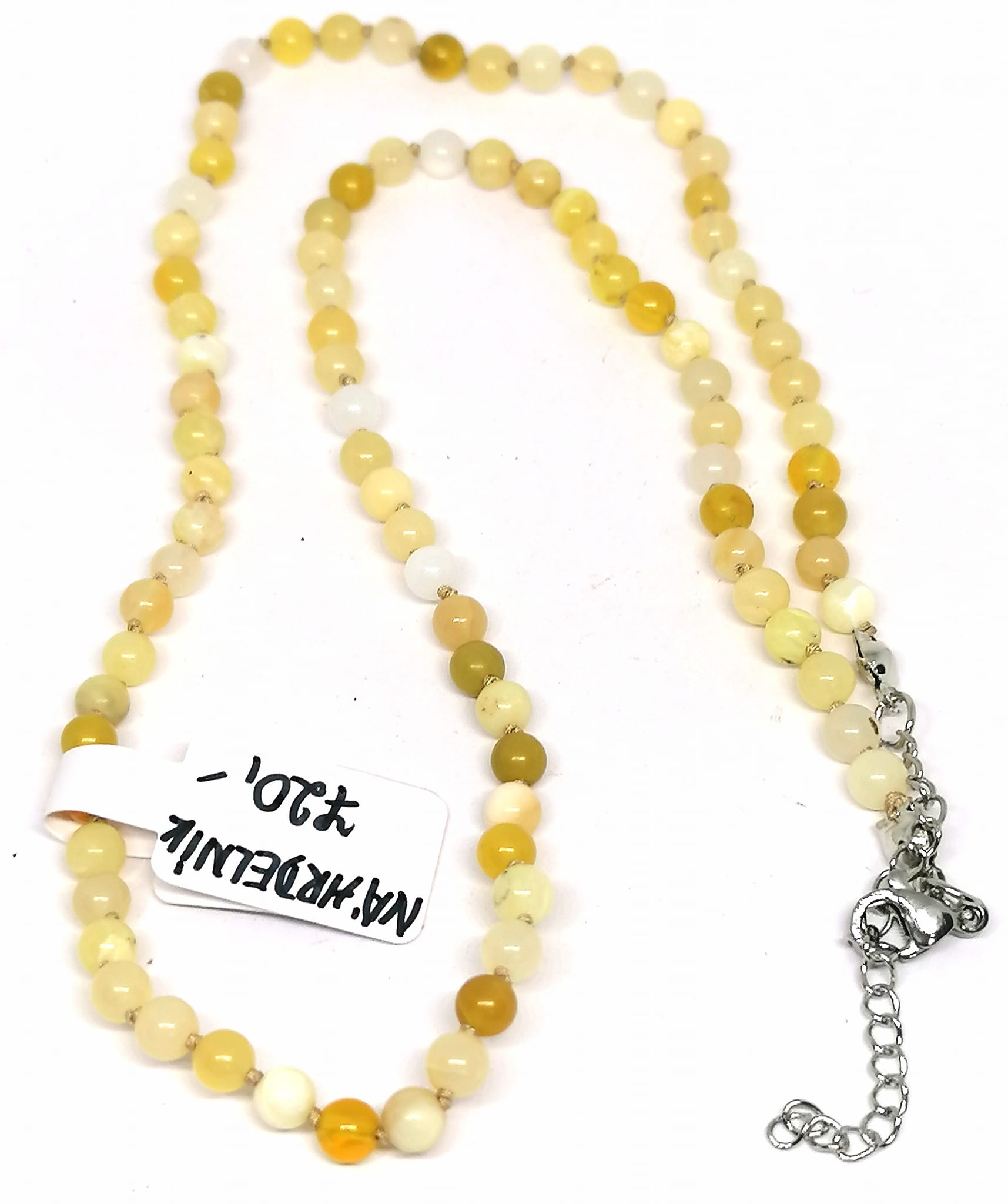 Náhrdelník ze žlutého opálu, kuličky jsou o velikosti 4 mm. Za každým korálkem je uzlík, což zabrání při přetržení rozsypání všech korálků.