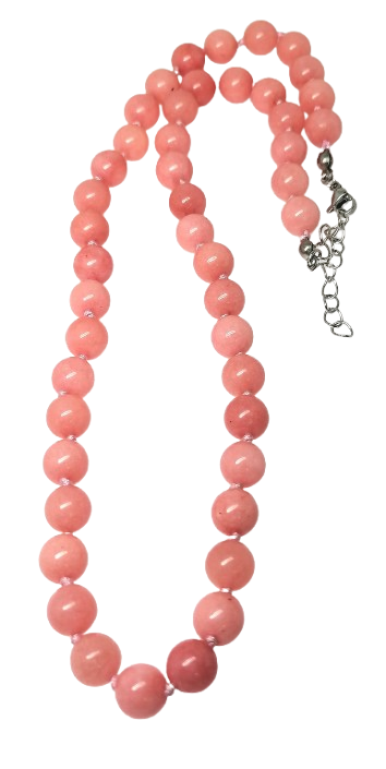 Stylový náhrdelník z broskvového jadeitu v jemném pastelově růžovo-meruňkovém odstínu je dokonalým doplňkem pro každý outfit. Přírodní 8mm kuličky jadeitu vytvářejí harmonický a luxusní vzhled, který vynikne při každodenním nošení i na slavnostních akcích.