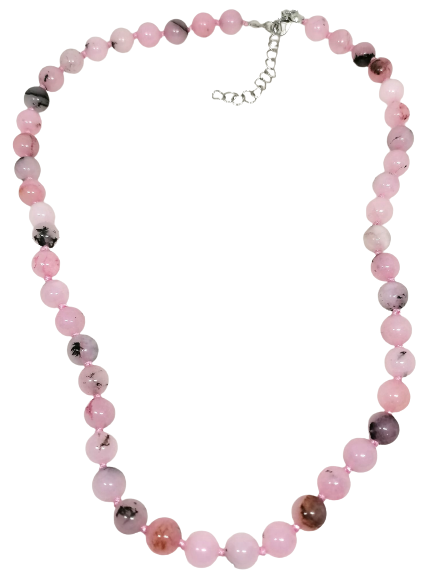 Korálky o velikosti 8 mm jsou pečlivě navlečeny na bavlněné šňůře a mezi každým korálkem je uzlík, který zajišťuje maximální bezpečnost – při případném přetržení se uvolní maximálně dva korálky. Celkový obvod náhrdelníku je 43–45 cm, doplněný o prodlužovací řetízek cca 5 cm s karabinkou pro pohodlné nastavení délky.