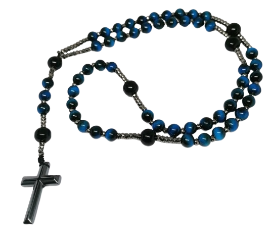 Výrazný náhrdelník, který v sobě spojuje sílu minerálů, ochrannou energii a symboliku víry. Kombinace modrého tygřího oka (barveného), černého onyxu a hematitu vytváří elegantní a mužný šperk, který zaujme na první pohled. Hematitový křížek dodává náhrdelníku hlubší význam a osobitý styl.