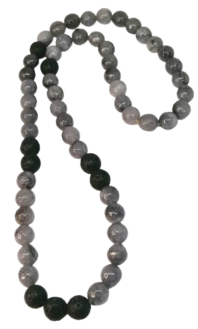 Stylový pánský náhrdelník z kombinace šedého jadeitu a černého lávového kamene působí moderně, přírodně a velmi mužně. Kontrast matné černé lávy a jemně šedého jadeitu vytváří výrazný, ale stále elegantní doplněk vhodný pro každodenní nošení.