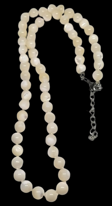 Náhrdelník z bílé perleti o velikosti kuliček 0,8 cm.