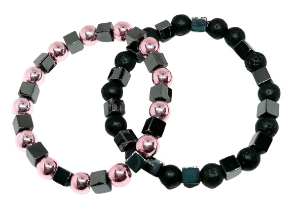 Pánský náramek je z černé lávy a lesklého hematitu, dámský z růžového hematitu doplněného šedými hematitovými kostičkami.