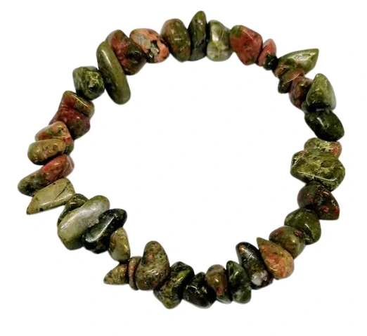 Unakitový náramek je tvořen drobnými sekanými kamínky přírodního unakitu, které jsou navlečeny na pružné a částečně roztažitelné gumičce pro pohodlné nošení. Šířka náramku je přibližně 8 mm a obvod se pohybuje mezi 18 a 19 cm, což vyhovuje většině běžných velikostí zápěstí.