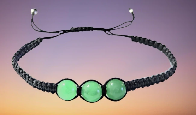 Elegantní Shamballa náramek s třemi kuličkami zeleného avanturínu (průměr cca 8 mm) spojuje krásu minerálu s praktickým posuvným uzlem, díky kterému se snadno přizpůsobí velikosti zápěstí. Vhodný pro děti i dospělé.
