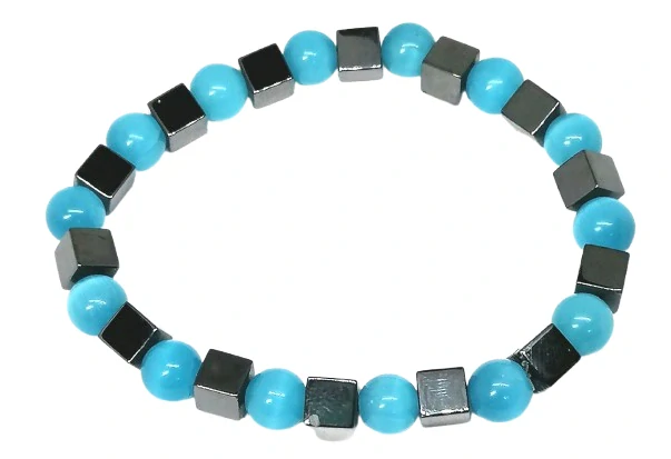 Elegantní náramek z hematitových kostiček doplněný modrým ulexitem (kuličky 8 mm) spojuje sílu uzemnění a ochrany s jemnou ženskou energií lásky a harmonie.