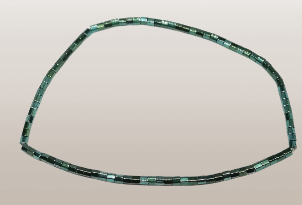 Náramek je vyroben z modrozeleného hematitu ve tvaru mini válečků.