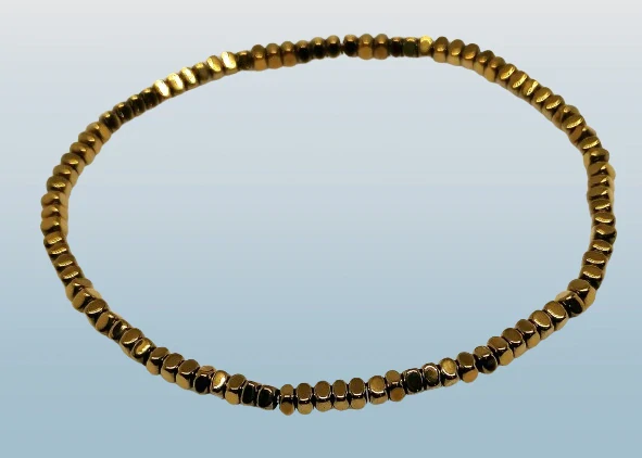 Elegantní náramek z maličkých kostiček (cca 2 mm) barveného hematitu o obvodu cca 19 cm je nejen stylovým doplňkem, ale také silným energetickým kamenem. Žlutý duhový hematit podporuje srdeční čakru, harmonizuje tělo i mysl a přináší vnitřní klid.