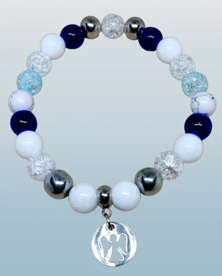 LEDOVÝ DECH - náramek z pukaného křišťálu, křemene, achátu a hematitu s přívěskem - ANDĚLÍČEK z chir. oceli.