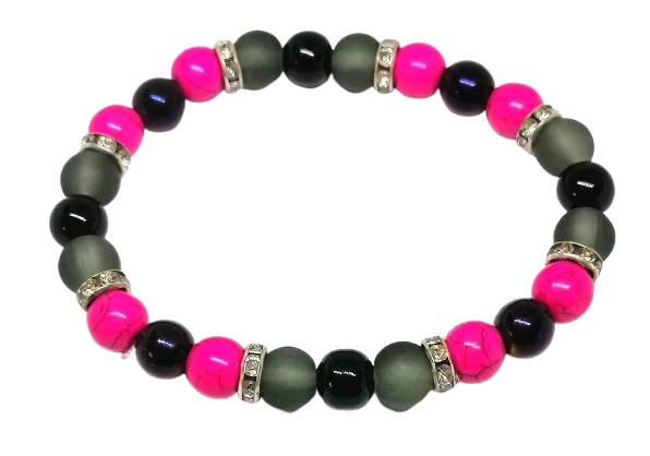 Stylový náramek z kombinace přírodních minerálů a třpytivých bižuterních vložek působí moderně, elegantně a zároveň originálně. Spojení fialového hematitu, šedého achátu, barveného magnezitu a černého obsidiánu vytváří výrazný kontrast barev i energií, který zaujme na první pohled.