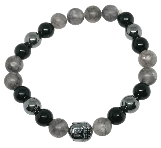 Pánský náramek z hematitu, onyxu a labradoritu, doplněný hlavou buddhy z hematitu.