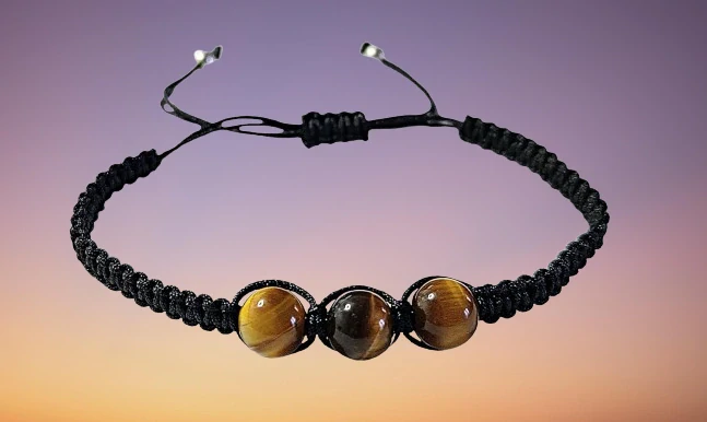 Stylový Shamballa náramek s třemi kuličkami tygřího oka (průměr cca 8 mm) spojuje ochrannou sílu minerálu s elegantním designem. Díky posuvnému uzlu je náramek nastavitelný, vhodný pro děti i dospělé.
