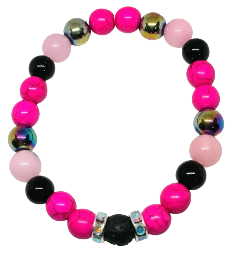Veselý sen, náramek z barveného magnezitu, hematitu duhového a jadeitu.