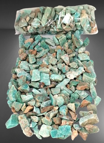 Balení je 400 g. Pro názornost na fotografii vidíte balíček i rozložených 400 g amazonitu.