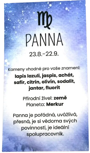 Esoterická kartička Panna – horoskop, planeta a živly na praktickém formátuihned 20 ks10 Kč/ ks8 Kč bez DPH