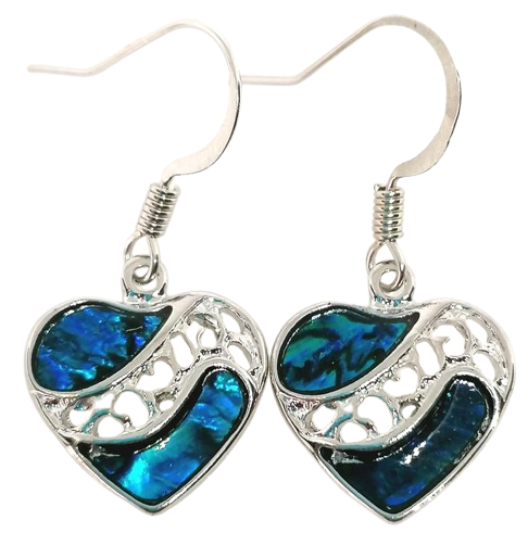 Naušnice srdíčka z paua mušle,který je zasazený do bílého kovu, neobsahujícího nikl.