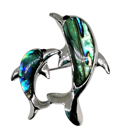 Brož a přívěsek dva delfíni s mušlí Paua