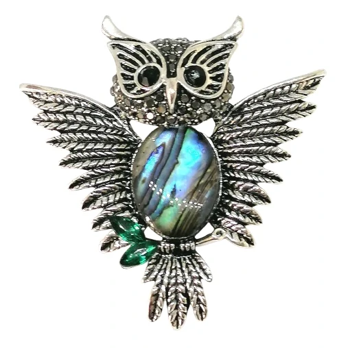 Brož a přívěsek Sova z Paua mušle – 2v1, bílý kov bez niklu, 4 × 4 cm