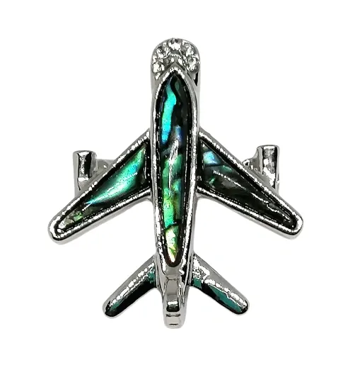 Krásná brož z paua mušle ve tvaru letadla, která pochází z Nového Zélandu.